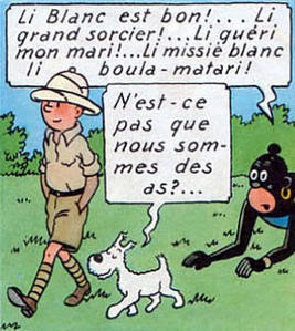 Blacks are represented as big children, fearful, lazy, incapable of any initiative, deeply gullible, naive and superstitious. Hergé The way to give voice to blacks is also very representative of the collective imagery. Uses terms specific to Swahili culture, such as Muganga which means one who healed so he's talking about these characters in "negro boy" in a permanent form of grammatical imperfection. The sentences are quite understandable, but they recall more of a mixed language deliberation, rather than a difficulty in speaking, and to make sentences in a foreign language. This standard language of the social representation of Black is now outlawed in the name of political correctness.